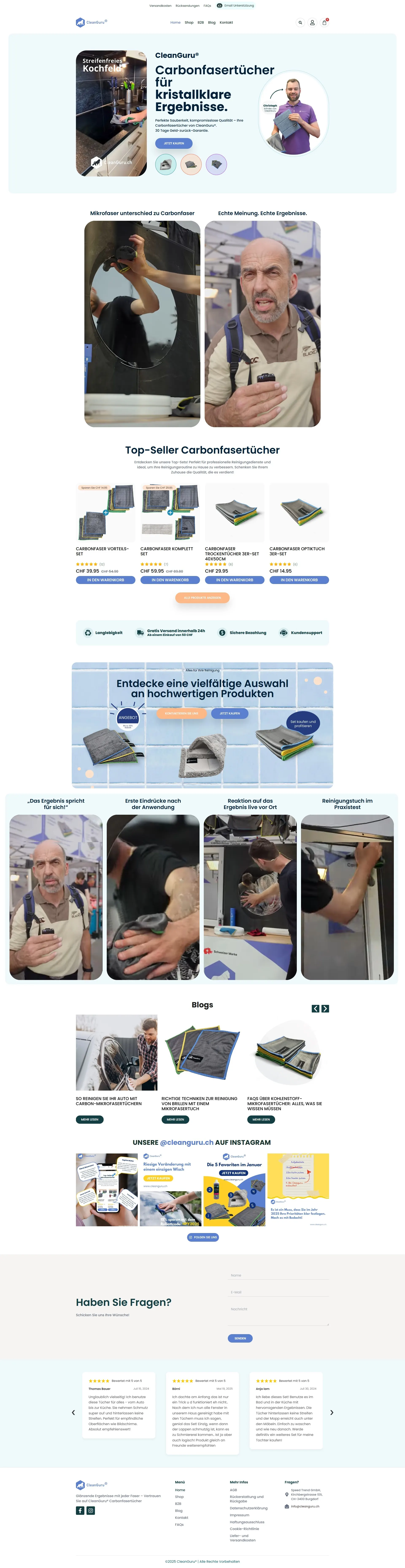 An online store offering high-quality cleaning solutions and accessories designed for streak-free, efficient cleaning at home, in cars and professional spaces. The shop features carbon microfiber cloths, mops, powerful cleaners and versatile cleaning sets, with clear product listings, pricing and secure checkout. CleanGuru also provides free shipping over CHF 50, a 30-day money-back guarantee and helpful cleaning guides in the blog section.
