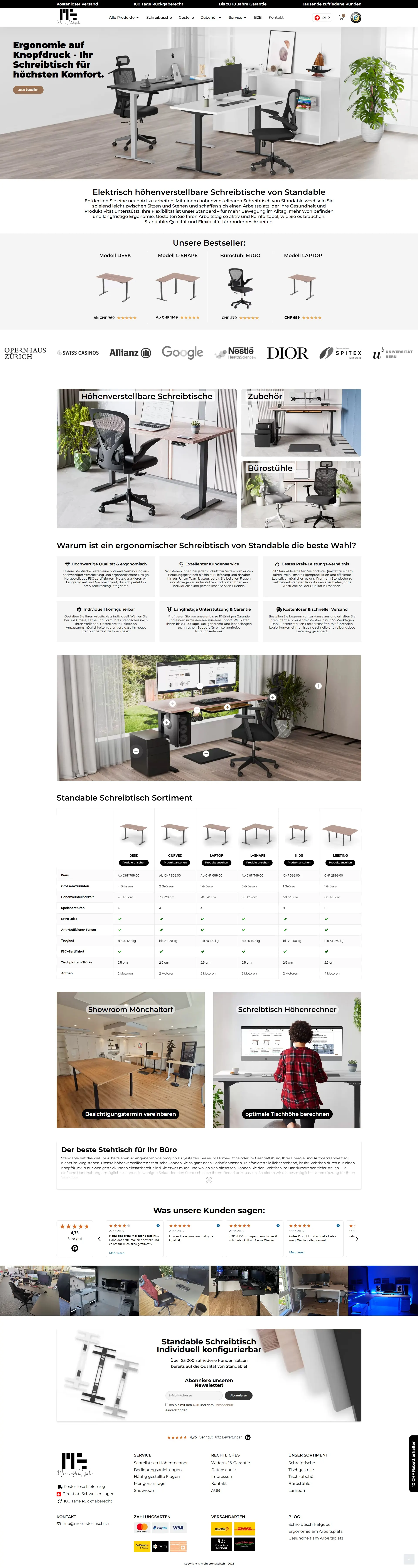 A Swiss online store focused on ergonomically designed, electrically height-adjustable desks and workspace solutions for home offices and businesses. The site offers a range of customizable standing desks (including straight, curved, L-shape, kids’ and meeting models), accessories like monitor arms, cable management and office chairs, with options to choose colours and sizes for a tailored fit. The brand highlights ergonomics, quality materials, free delivery, extended guarantees and strong customer support, backed by positive user reviews.