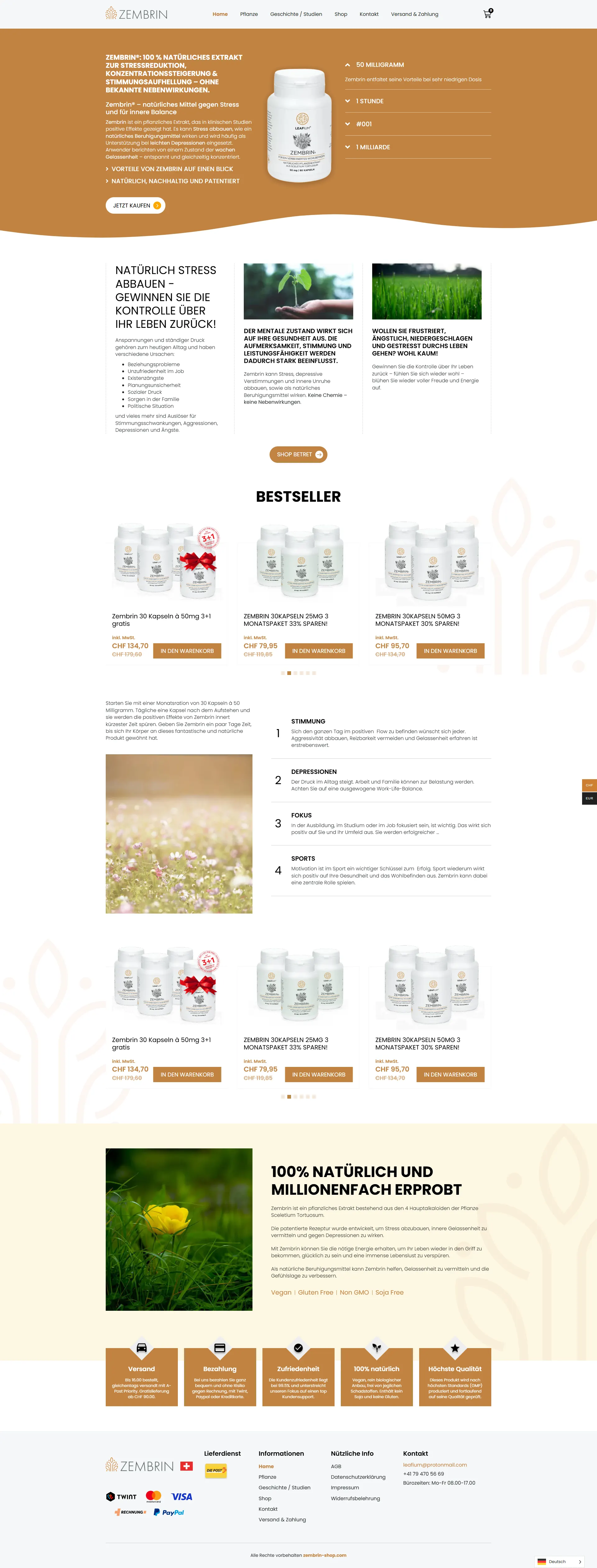 An e-commerce store offering Zembrin® dietary supplements, a patented 100% natural extract of Sceletium tortuosum designed to support stress reduction, mood balance, focus and overall well-being. The shop lists multiple capsule variants (different strengths and quantities), highlights product benefits, and provides easy purchasing options with clear pricing and descriptions.