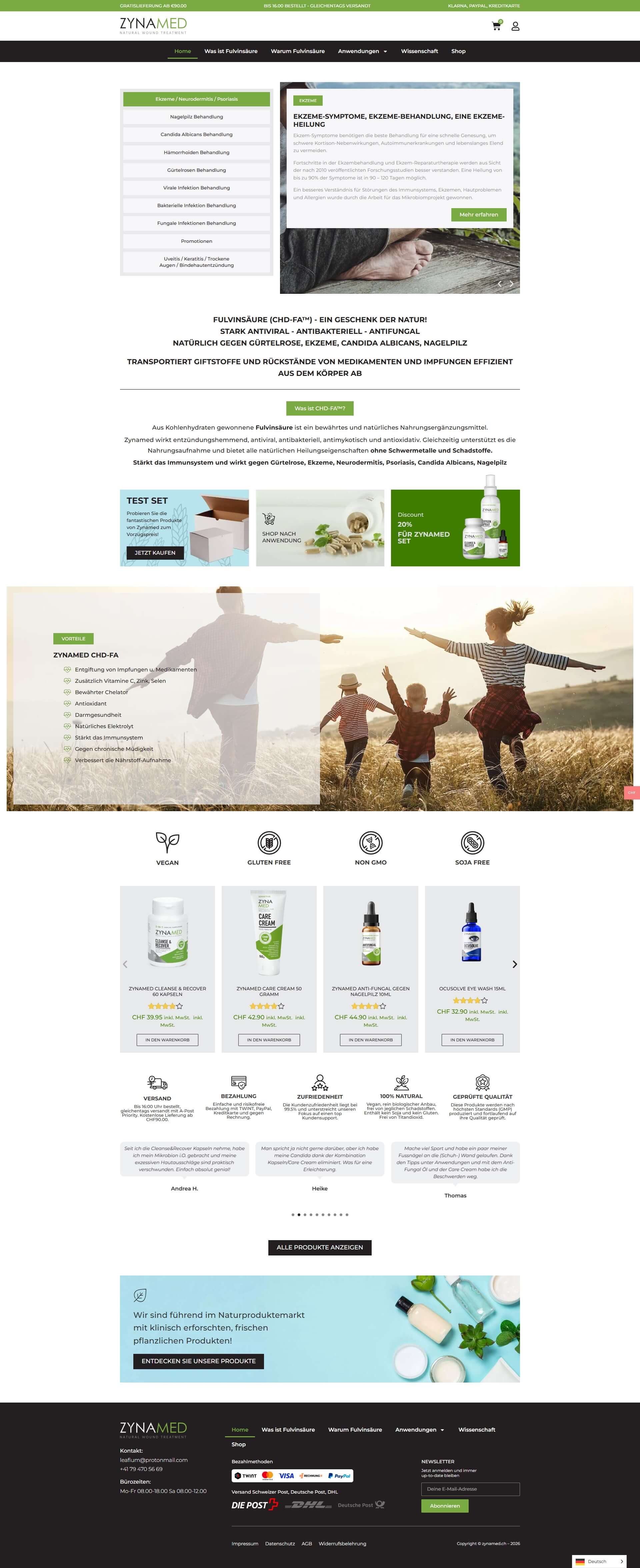An e-commerce store offering natural health and wellness products based on fulvic acid (CHD-FA™), designed to support immune function, skin health, and overall recovery. The shop features dietary supplements, creams, sprays, and antifungal treatments aimed at conditions such as eczema, fungal infections, candida, and viral skin issues, highlighting natural ingredients, clinically inspired formulations, and convenient online purchasing with clear product information and pricing.